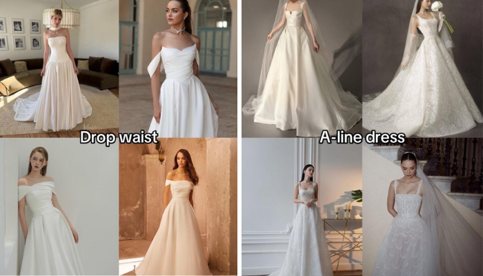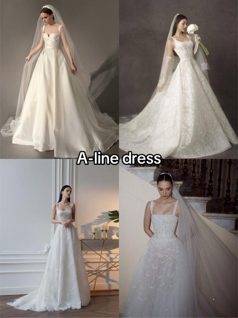 From silky satin to shimmering lace A-line gowns (like the ones in the image), this style is perfect if you’re into luxury bridal fashion with a touch of modern edge. Pair it with a long veil, soft glam makeup, and you’ve got an effortlessly elegant bridal look that never goes out of style.