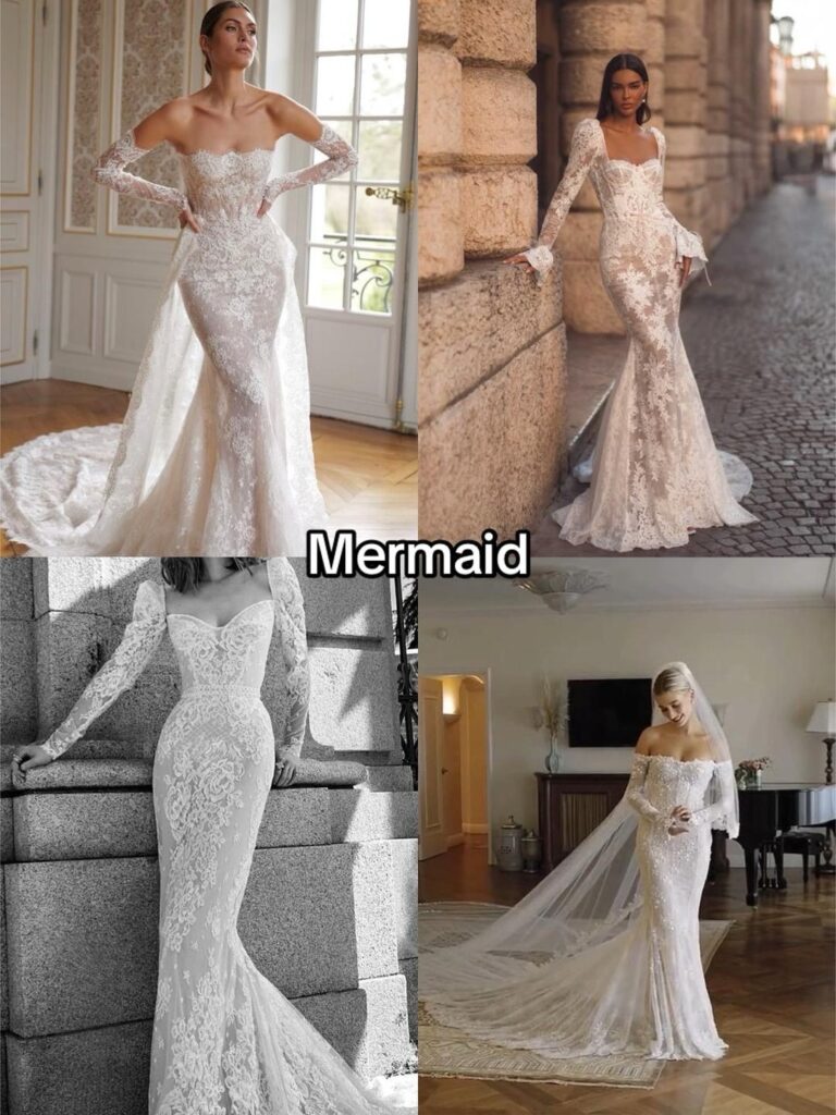 Mermaid wedding gowns are made for brides who want to make an entrance and own the spotlight. Fitted at the bodice and hips, then flaring out below the knees—this silhouette celebrates curves in the most stunning way. Add lace details or sequins and suddenly you’ve got the perfect mix of bold and romantic.