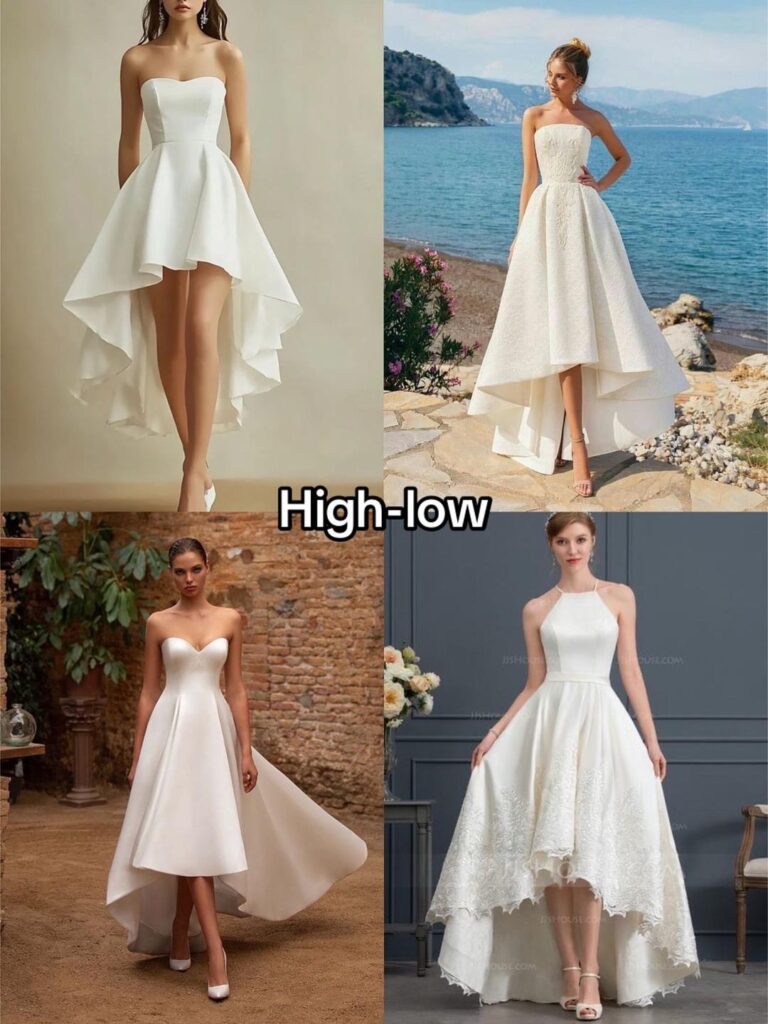 This style is perfect for beach weddings, chic garden ceremonies, or even as a fun reception look. The high-low gowns in the image mix edge with elegance—think sweetheart necklines, structured fabrics, and that dramatic flow in the back. Oh, and bonus: no tripping over your hem walking down the aisle. Total win!