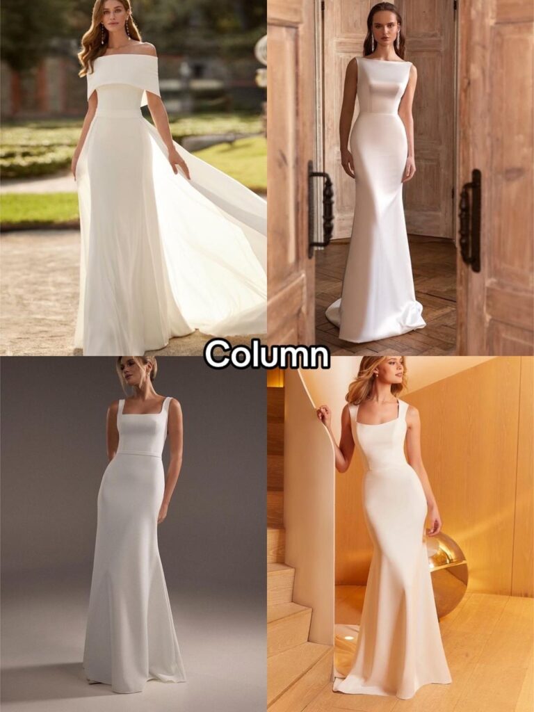 Column wedding dresses are the definition of chic. Clean lines, effortless elegance, and that tall, graceful vibe that never goes out of style. They softly skim the body instead of clinging too tight—giving you a polished but comfortable look.