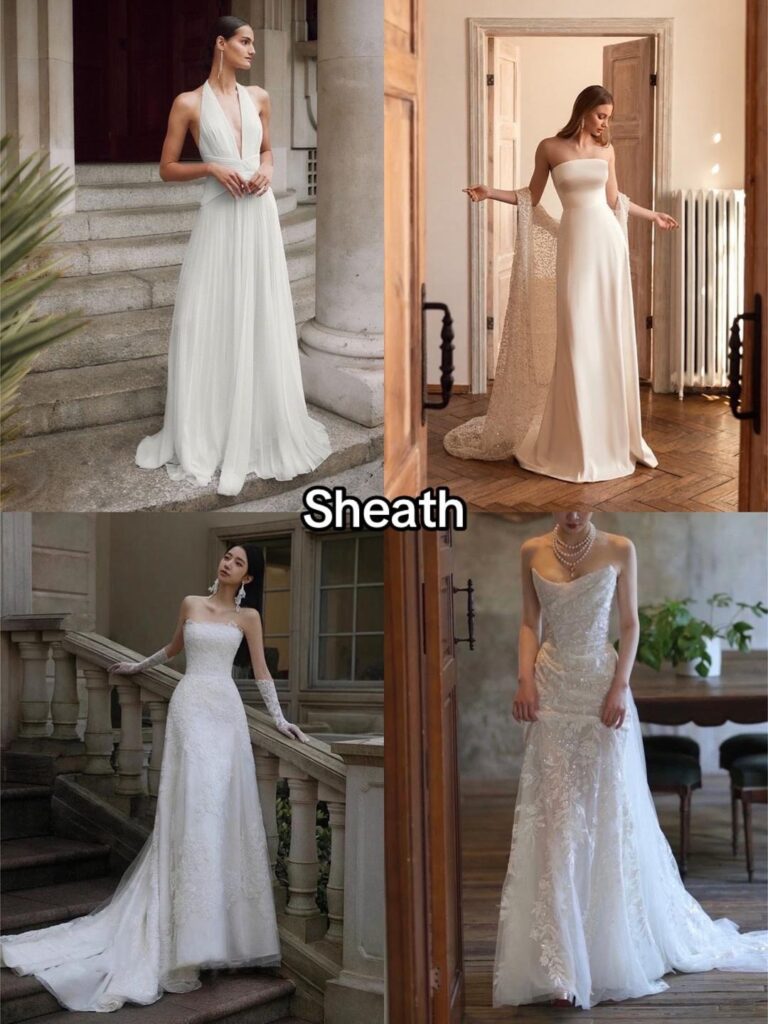 Sheath bridal gowns are all about flow and ease. They fall straight down the body, creating a relaxed yet elegant silhouette. Super lightweight and easy to move in, they’re perfect for brides who want to dance, walk barefoot on the beach, or keep it simple without losing that wow factor.