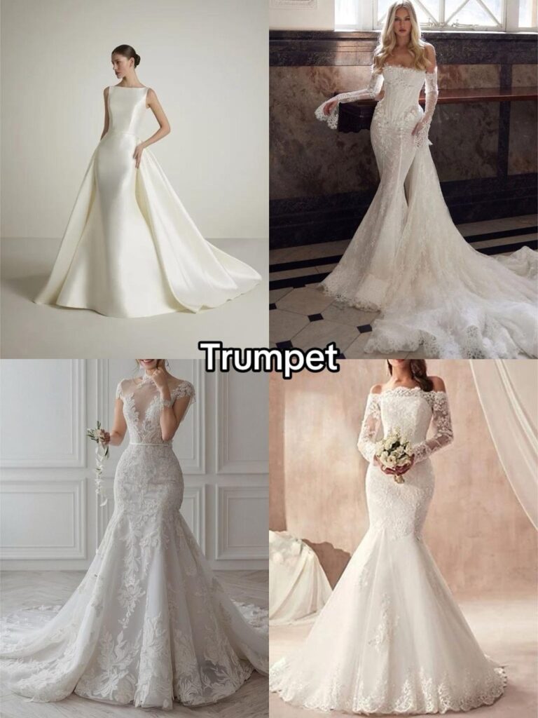 Trumpet wedding dresses are all about balance—glamorous but still comfy enough to move around in. They hug the body through the bodice and hips, then flare out around mid-thigh. The result? A gorgeous hourglass shape that feels dramatic yet totally wearable.
