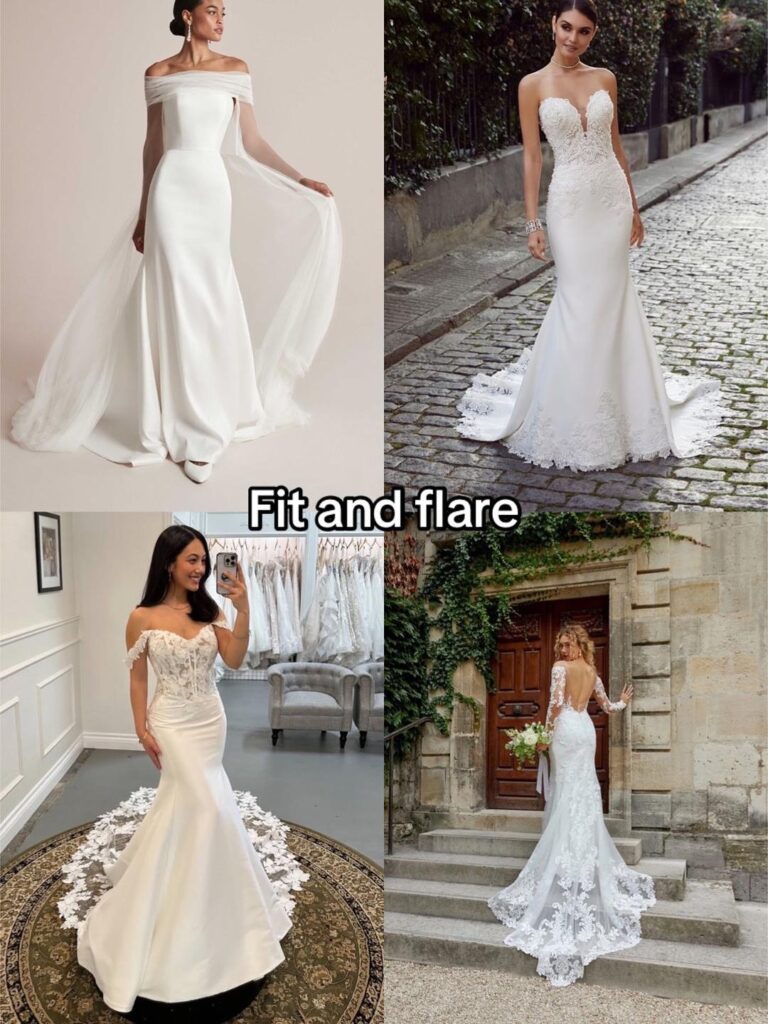 Fit and flare wedding dresses are like the perfect middle ground. They hug your curves through the bodice and hips, then gently flare out around the mid-thigh. Think of it as a mermaid dress but way comfier and easier to move in.