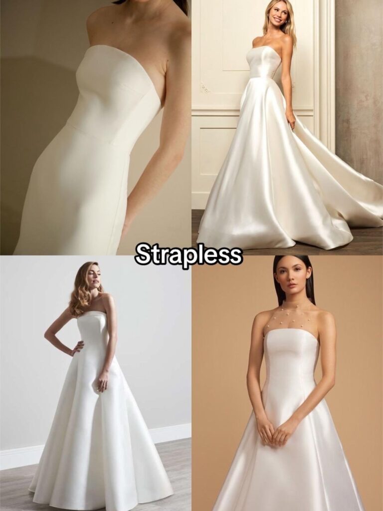 Strapless bridal gowns are the ultimate classic. They highlight your shoulders and collarbones beautifully, creating a feminine and elegant silhouette. Perfect for summer weddings, outdoor ceremonies, or any bride who loves a clean, timeless look.