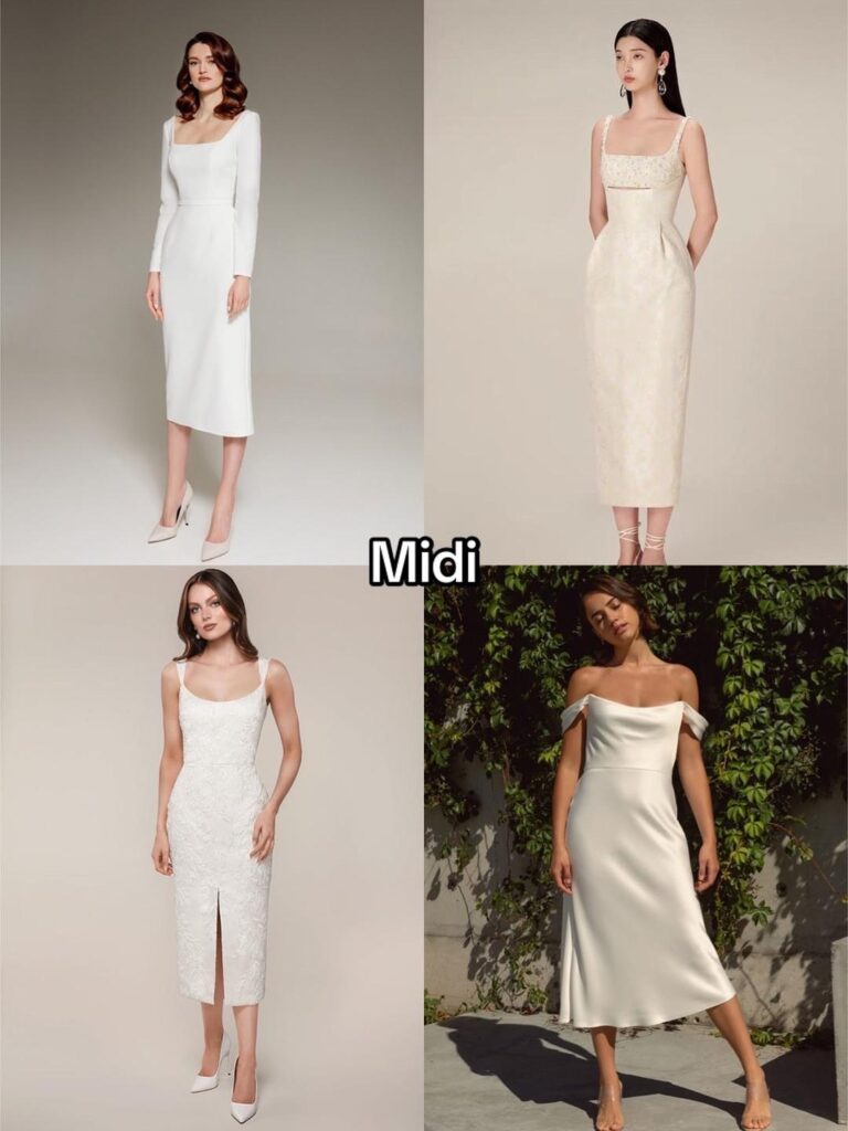 Great for courthouse weddings, stylish receptions, or minimalist brides who love understated elegance. Plus, midi wedding dresses are easy to style—pair with bold heels, a statement clutch, or even a sleek ponytail for that fashion-forward bridal edge.
